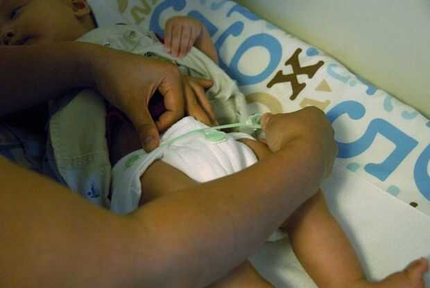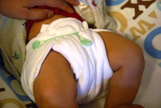 El snappi es en forma de "T". Enganche la parte superior de la T a las esquinas traseras del pañal y la pierna de la T al rectángulo frontal.