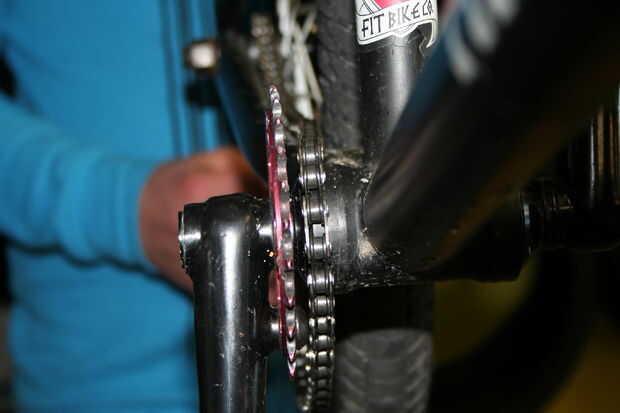 Con la mano izquierda, empuje la cadena en el interior de la moto. Mientras empuja la cadena, gire las manivelas con su ala derecha. Si lo has hecho correctamente, la cadena debe estar en el interior de la rueda dentada.