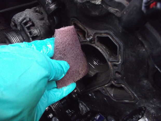 Utilice ScotchBrite o lana de alambre para limpiar la cara de acoplamiento dispuesta a aceptar la nueva bomba. NOTA: Hay un video en Youtube de alguien haciendo este trabajo, y una hoja de afeitar se utiliza para raspar la superficie limpia. Personalmente evitarlo como el bloque del motor es de aluminio y pueden dañarse fácilmente con cualquier cosa que no sea un raspador de plástico.