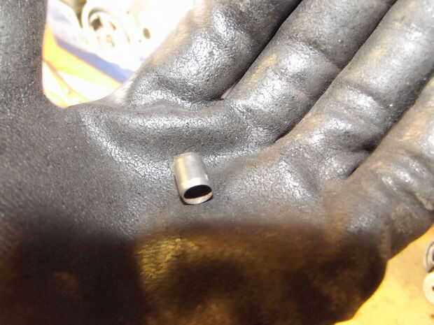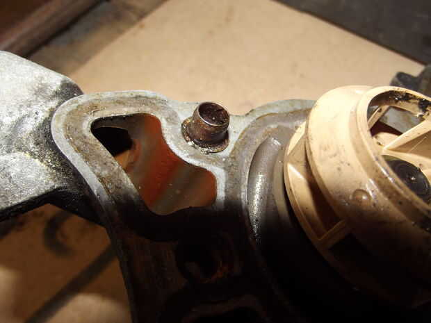 Un poco de calor aplicado con el soplete a la fundición de aluminio bomba cerca de la espiga pronto lo liberó para arriba y era capaz de quitar cuidadosamente con unas pinzas. Una vez limpiado el pasador empujado fácilmente en el lugar correcto en el bloque del motor.