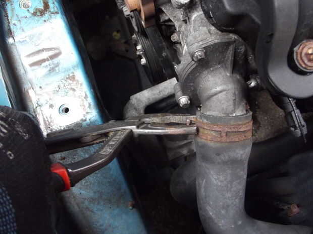 Todos entrada salida de mangueras / electricidad etc., es necesario retirar para que la bomba de agua es libre. Utilice alicates de la bomba de agua para apretar las abrazaderas. A menudo es más fácil empujar el clip más abajo de la manguera de la llave, permitiendo que usted retire la manguera libremente, en lugar de intentar sostener el clip abrir y sacar la manguera al mismo tiempo. Las mangueras de agua a menudo se pegan firmemente con residuos, pero un destornillador romo o algo que no perforar la manguera puede generalmente ser se deslizó debajo del borde para persuadir la manguera a la parte de la compañía. Cuando usted Tire lejos, agua todavía llevó a cabo en el sistema por la presión de vacío debe filtrar fuera el tapón de drenaje abierto.