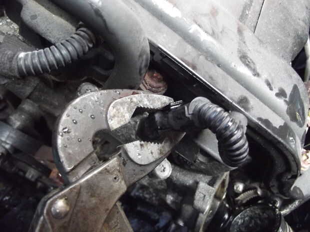 Retire la clavija del sensor de temperatura de agua en la parte superior de la bomba de agua. Usé un par de pinzas para apretar con cuidado la lengüeta de plástico como no era lo suficientemente libre como para quitarse a mano.