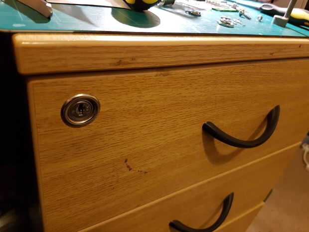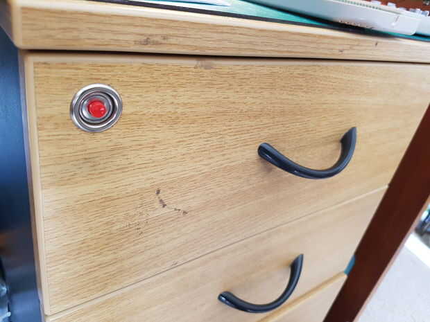 He comprado un conjunto de cajones de una tienda de caridad, vino con una cerradura, pero no las llaves. Tenía un botón ahí y pensé que podría hacer una adición útil algún día. Tenga en cuenta, en este momento el botón no está conectado a nada. Eso es para que usted pueda pensar.