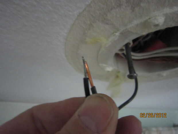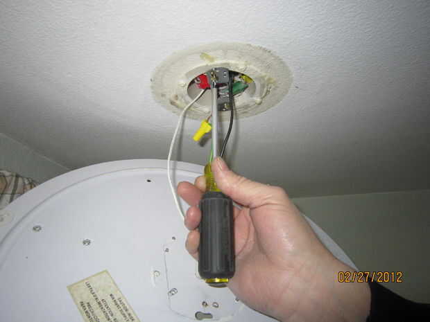 Ahora tenemos que conectar la nueva luz. Coinciden con los cables negros con los cables de casa negro y alambre tuerca les juntos. Si el trenzado de los cables de la luz, (compuesto de muchos filamentos poco dentro de una capa aislante, a diferencia de un cable sólido dentro de una capa aislante como usted son los cables de la casa,) que desee sostener el cable trenzado para que sólo sobresale un poco y entra primero la tuerca para alambre. Ver la foto si no era una declaración clara. Hacer lo mismo con los cables blancos. Que tendrás que usar una tuerca de alambre más grande si hay más cables de la casa blanca. Sólo asegúrese de que conectes todos los cables exactamente igual como lo fueron antes de que descolgó la vieja luz. Tome fotografías o marcarlas con cinta antes de que se les desenganchen si necesita. Conectar los cables de tierra y luego rellenar todos los alambres de exceso en la caja de techo. Sólo necesita obtener suficiente allí para asegurarse de que eres bastante nuevos luz coquetos hasta firmemente al techo.