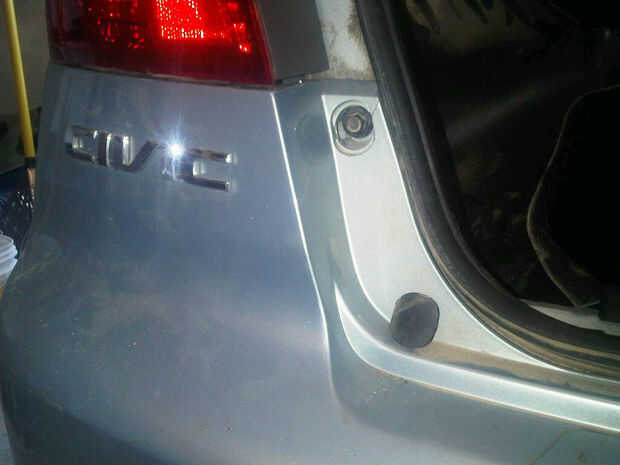 En la parte posterior del parachoques en donde el tronco se cierra, y cerca de la luz trasera, notarás un poco negro enchufe que puede estallar hacia fuera con un destornillador o la uña. Debajo de eso es un perno que usted necesitará una toma de corriente para quitar. Hacer eso.