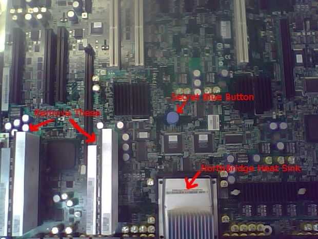 Si usted tiene un tercer o cuarto procesador, también tendrás uno o dos tableros adicionales, a la izquierda del northbridge. Estas se llevan a cabo en el lugar como módulos DIMM, sólo empuje los pestillos lejos de ellos y tire de ellas hacia fuera. Recuerde donde van!