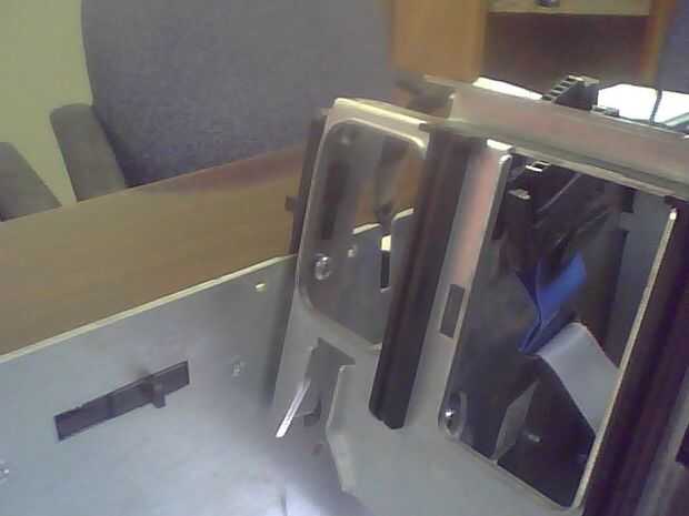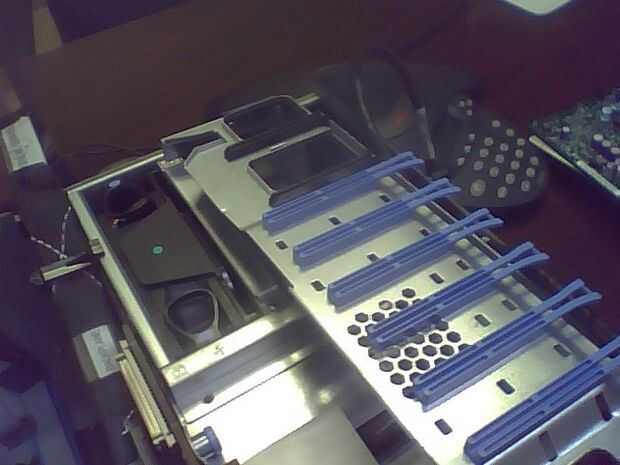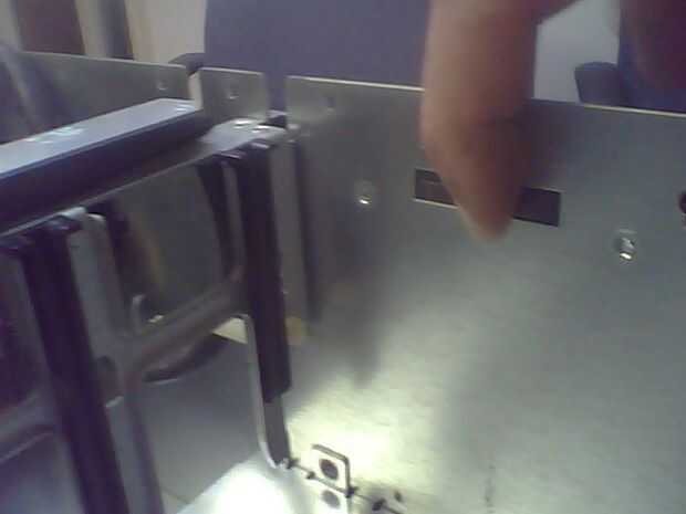Hay dos pestañas negras en las paredes laterales que usted necesita para empujar hacia la parte posterior del servidor. luego pueden levantar la barra hacia fuera. Tenga cuidado con el cable scsi conectado a la barra si tienes uno.