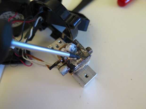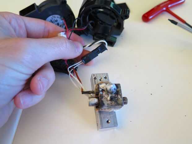 Desconectar el conector del cartucho calefactor, luego Desenroscar el tornillo hexagonal y extraer el cartucho calentador. Mina estaba super sucio así que hice algunos persuasión suave con unos alicates y una pistola de calor. Después de que el cartucho fue quita que limpiar tanto el residuo plástico quemado como pude con un cuchillo xacto, teniendo cuidado de no dañar el cuerpo real del cartucho.