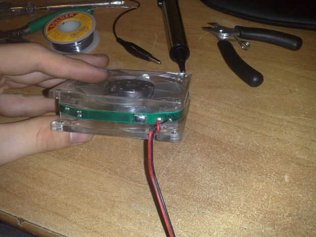 Hacer 3 agujeros como etiquetar en la foto con el soldador o con una dremel en el caso de ventilador de tipo simple... en el tamaño de tus leds rgb de... También tienes que soldar cables al rojo + y - negro en la parte posterior del ventilador para alimentar los leds...