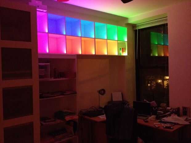Esto comenzó como necesitaba un almacenamiento extra a continuación y encima de un escritorio, pero quería darle algún diseño especial. ¿Por qué no utilizar las tiras de LED increíbles que pueden abordarse individualmente y toman cualquier color?