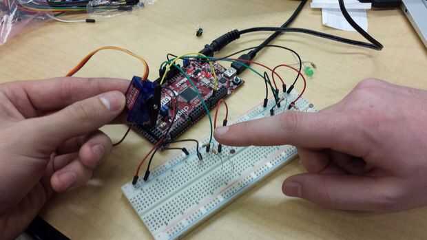 La tira del LED es representante de una lámpara dentro de una casa moderna, por lo tanto una forma eco-amigable y rentable de alimentar la lámpara debe ser elegida. Hemos decidido que un panel solar sería una forma viable de alimentación electrónica pequeña. Un panel solar, en teoría, deberá colocarse en el motor de servo que se une a fotorresistores que actúan como dispositivos de "seguimiento solar". En este caso, puede colocar un dedo en una resistencia y el servo se convertiría en una dirección dada y viceversa. Así, cuando uno de los fotorresistores tenía menos luz golpeando, no simulando ninguna luz del sol golpea la superficie, el servo se movería en la dirección donde ambos fotorresistores tendría la misma cantidad de sol golpearse con ellos, simulando la orientación óptima para la interacción de la luz del sol. Esto más tarde se aplicaría en el techo de nuestra casa modelo.