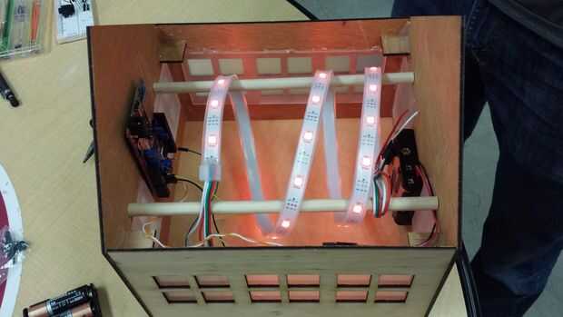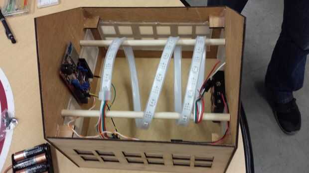 Dos tacos de madera eran fricción cabida entre el frente y detrás del modelo que se convirtió en el apoyo de envolver el LED tira alrededor. Estábamos buscando para conseguir los LEDs suspendidos en el aire y el suelo del modelo, esto reduce la cantidad de LEDs vistos a través del vidrio esmerilado produce un limpiador y distribución más suave de la luz.
