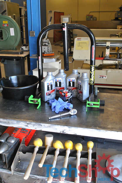 Aquí tenemos una foto de los materiales necesarios para el cambio de aceite. Una parte muy importante del equipo es un soporte trasero paddock. Estos se pueden tener bastante barata en una tienda de accesorios de motos locales. Elegí mio por unos $40. Si su bicicleta viene equipada con un soporte del centro entonces que no se necesitan el soporte trasero del paddock. También decidí usar aceite totalmente sintético de este instructable puesto que es un poco mejor que el aceite de motor normal.