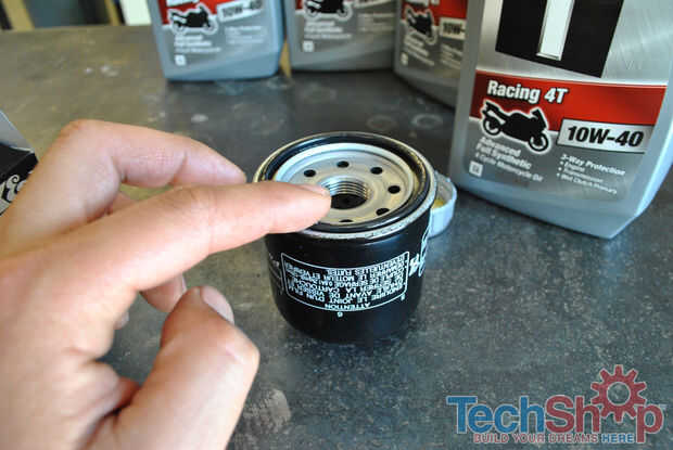 Sumergir el dedo en el nuevo contenedor de aceite y untalo en la junta tórica del filtro de aceite nuevo. Esto asegurará un buen sellado cuando se instale el nuevo filtro de aceite.
