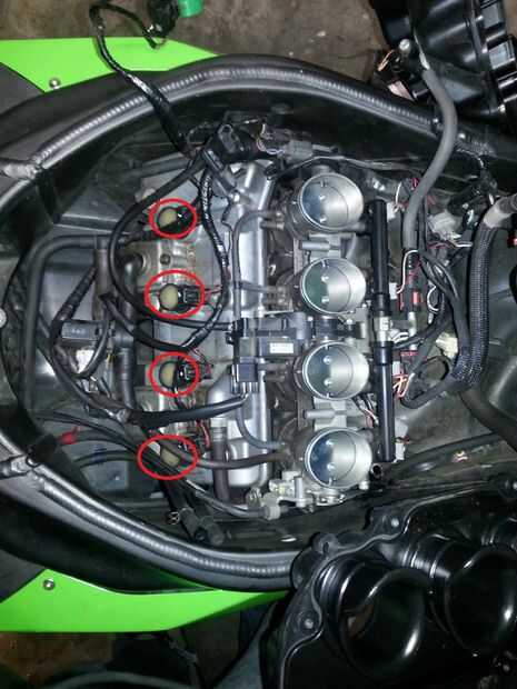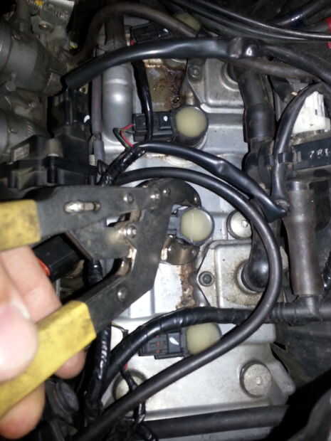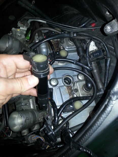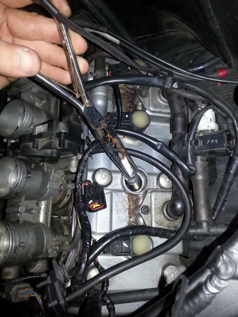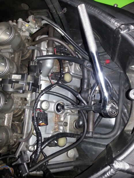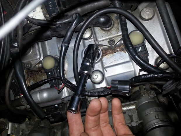 • Ahora viene la parte difícil. En la zx6r 2008, consiguiendo la caja de enchufe de chispa de 5/8" y su extensión en el área pequeña para quitar la bujía puede ser una tarea desalentadora porque no hay mucho espacio. Para conseguir alrededor de esto usar una extensión más pequeña y una mediana de extensión en lugar de una sola más grande. Tome el enchufe de bujía 5/8" y fijar la extensión de 4", la caída de ellos en el hoyo. Siguiente: tomar la extensión de 6" y mate con sus 4". Hacer esto le dará un montón de espacio para trabajar y te permite quitar los tapones más fácilmente. Si la bujía sale con el zócalo después que, use las pinzas para recuperarlo. Repita para todos los cuatro enchufes de chispa. ** Nota, hacer este proceso con cuidado. Uso de metal alicates o pinzas en un espacio reducido puede causar residuo metálico o virutas que caen en el motor si no eres consciente de lo que estás doing.* *