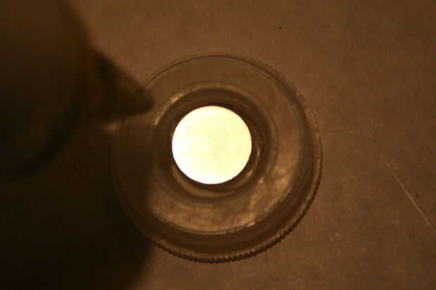 Tomar el segundo imán y pégalo en la tapa de la lata de película. Si la polaridad es correcta atraerá la "vela" en su lugar. No ponga "vela" a base de todo. Prueba de polaridad antes de pegarlas.