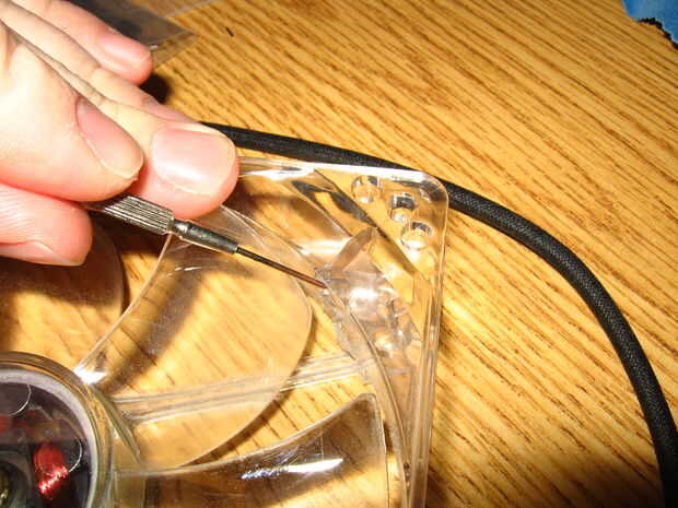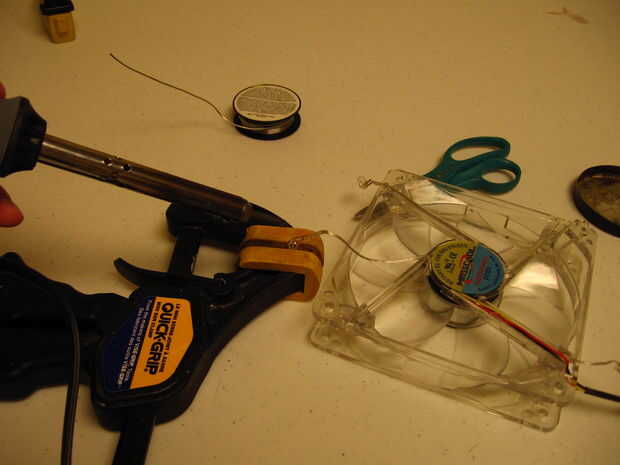 Para empezar, necesitas modificar el ventilador por lo que tiene de LED RGB en él. La parte más difícil es quitar el antiguo LED como que probablemente te pegan bastante bien. Me llevó un destornillador pequeño y expulsados desde la parte delantera (tenga cuidado alrededor de las aspas del ventilador, no romperlas). Después de empujar hacia fuera, desoldar el LED azul y ponerlos en mi cubo de piezas (todavía trabajan, por lo que serán útiles más tarde). Yo entonces pegado los cables del LED con cinta transparente para que no cortocircuite las.