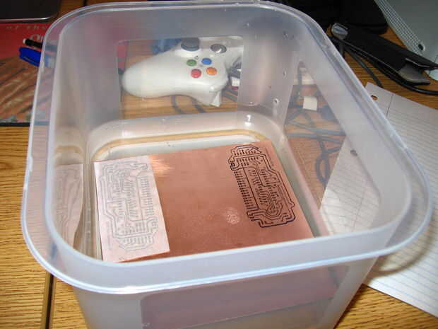 Después ya tienes tu tabla listo, corte la parte de la Junta desea que salen de cualquier tarjeta que desea mantener sin usar con una dremel. Luego tomar la placa que desea grabar y pegar en una solución de reactivo (utilicé cloruro férrico, pero hay muchas cosas que se disuelven el cobre).
