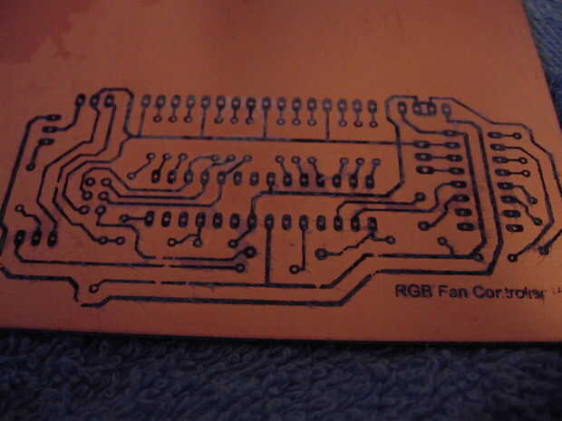 Después del grabado, no debe ser cobre visible pero bajo el tóner negro. Esto significa que es listo, sacar la Junta y entonces use acetona (quitaesmalte) para deshacerse del toner negro y exponer el cobre. Ahora estás listo para soldar, suponiendo que no existen partes faltantes importantes (una pausa no es un gran problema, se puede salvar con soldadura, una almohadilla que falta es más difícil de solucionar, pero mina fue lo suficientemente cerca de la traza que puenteado fácilmente.