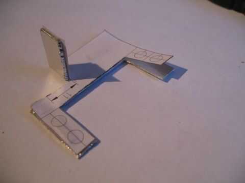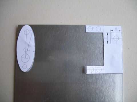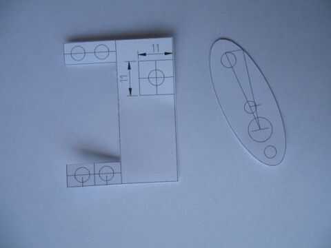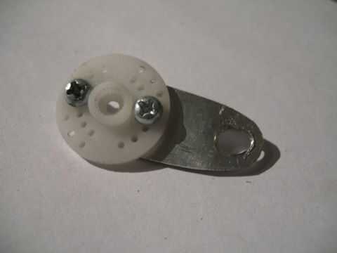 Cortar agujeros en el brazo de montaje (según plantilla) y la rueda del servo a éste con tornillos #3. Cortar cualquier longitud del perno exceso después de colocar una tuerca.