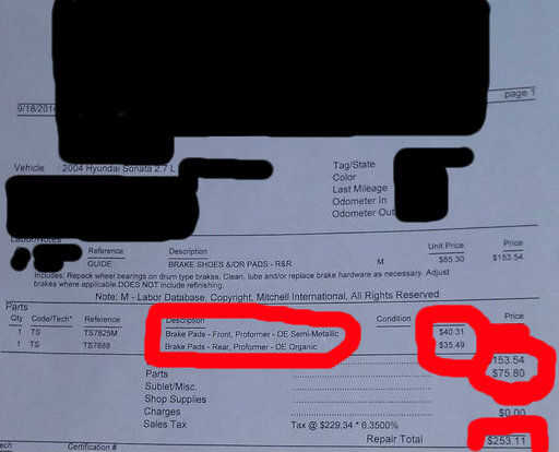 Hace poco fui a conseguir una inspección de seguridad de mi coche y descubrí que mis pastillas apenas habían pasado con número mínimo. Se informó que los cambio por otros nuevos, el único problema era, que querían cobrarme más de 250$ (cuadro 2). Exploró mis otras opciones y descubrí pude conseguir frenos delanteros y traseros en NAPA para apenas debajo de 50$.