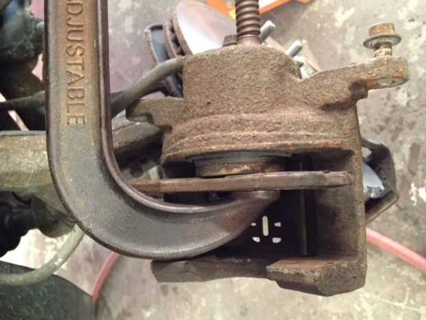 Ahora debe comprimir el pistón de la pinza. Usando un viejo Zapata y c clapm, comprimir el pistón.