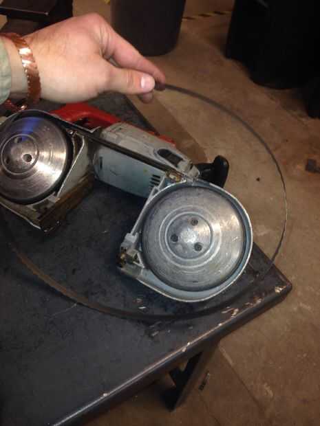 Mirando la herramienta, hay una palanca de tensión en el lado izquierdo que libera la tensión de la hoja. Después de que la palanca esté en posición, una de las ruedas de sierra mueve hacia adentro, permitiendo que la lámina para quitar. Deslice las cuchillas de ambas ruedas y retire. Asegúrese de que la herramienta esté desconectada antes de tocar la hoja.
