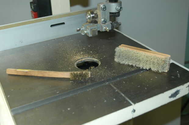 Utilice un cepillo de cerdas o un cepillo de alambre de latón para limpiar los neumáticos de goma. Si no no es mucho acumulación de serrín debajo de la hoja, luego un cepillo de cerdas funciona bien. Pero a veces no es suficiente para ir al cepillo de alambre. El resultado final es un neumático liso con no aserrín aferrándose a él. (En algunos casos cuando lo he practicado pobres "higiene de la sierra," te he necesitado recurrir a un raspador para quitar el serrín en las llantas.)