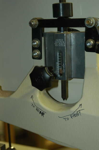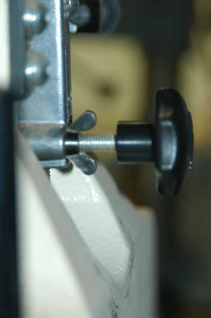 La imagen 3 muestra la hoja demasiado hacia la izquierda de la rueda. Usando la perilla a la izquierda de la tensión primavera (imagen 1), afloje la tuerca de mariposa y gire la perilla hacia la derecha o hacia la izquierda girando las ruedas y el disco en la rueda de centro (imagen 4).