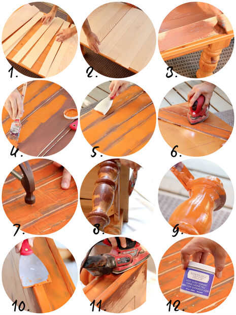 10:05 minutos, raspar la pintura naranja para conseguir un look astillado, envejecido
