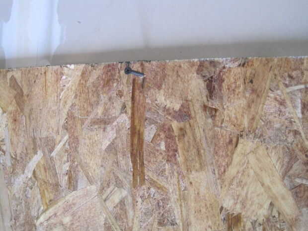 Poner la madera contra la pared y colocar una tira vertical de cinta para mostrar ayuda donde cada uno de los postes de madera son. Entonces, coge el destornillador eléctrico y perfore orificios piloto para cada tornillo (utilicé una broca de 3/32). Introduzca un tornillo en cada uno de los orificios piloto. Deberá usar fuerza he-man para obtener algunos de lo tornillo en. Utilice una escalera para los tornillos de arriba porque empujando el destornillador es difícil si es en cualquier lugar por encima de su cabeza.