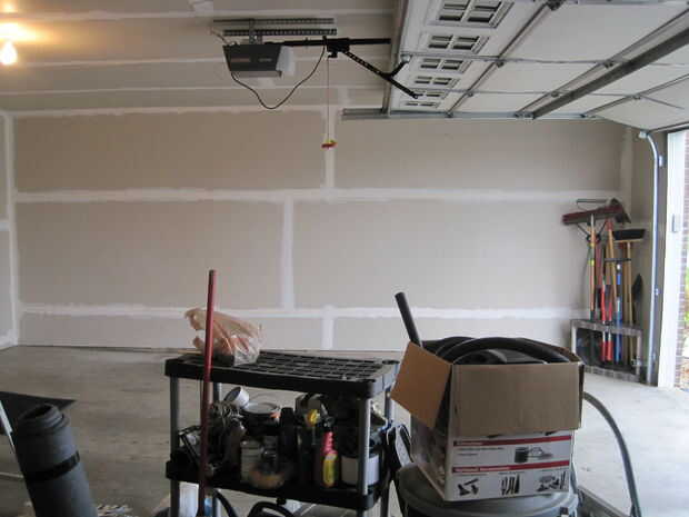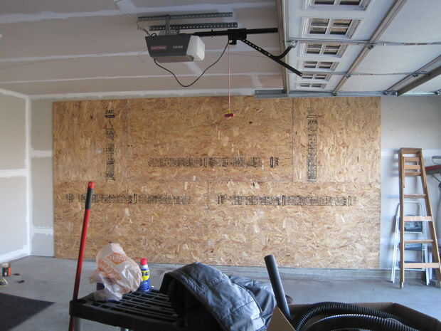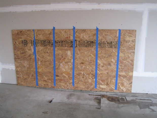 Después de lijar, localice los montantes en la pared. Era un poco de suerte porque el garaje era yeso, que encontrar las vigas muy fácil. Hubo evidentes líneas verticales de tornillos en la pared que marcaba donde estaban los postes de madera. Si tu garaje es diferente, asegúrese de agarrar un localizador de montantes y trace líneas de tiza vertical para marcar las ubicaciones de los montantes.