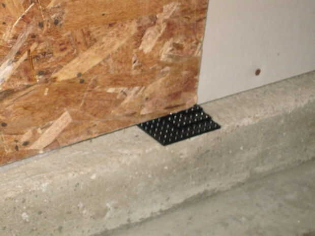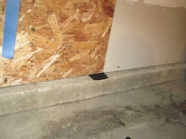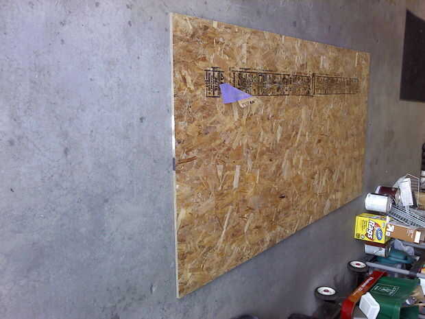 Suelos de garaje también tienen pendientes molestosas que hace la colocación de los tableros un poco más complicado. Usted puede tratar de trazar una línea horizontal en el borde inferior de las tablas de madera contrachapada irá con alguna tiza y un nivel de láser (o tal vez algún otro dispositivo). Alineado mi primera tabla (parte inferior izquierda) con un pequeño saliente concreto que fue hacia el fondo de mi pared. El borde tenía poca pendiente, por lo que necesitaba para levantar la segunda junta (abajo a la derecha) alrededor de una pulgada para conseguirlo sentarse a ras con la primera junta. Utilicé algunas piezas de placa LEGO a las cosas de la línea para arriba. Cada placa LEGO es de 3,2 mm y una pila de placas puede tomar fácilmente el peso de la madera contrachapada. Después de que la Junta se atornilla, retire las piezas de lego (o lo ha utilizado).