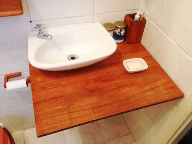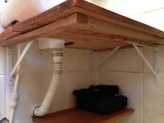 Hecho con dos tableros juntos y fijar como estantes. Sólo tienes que cortar un semicírculo para el fregadero.