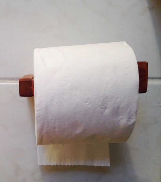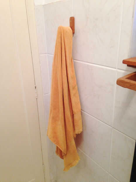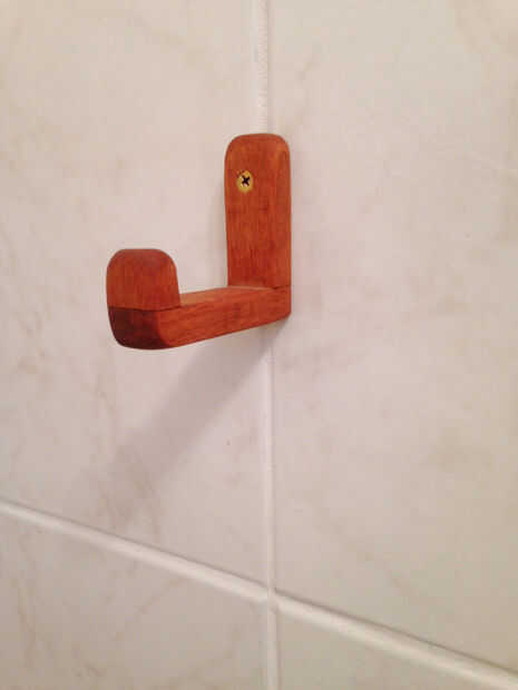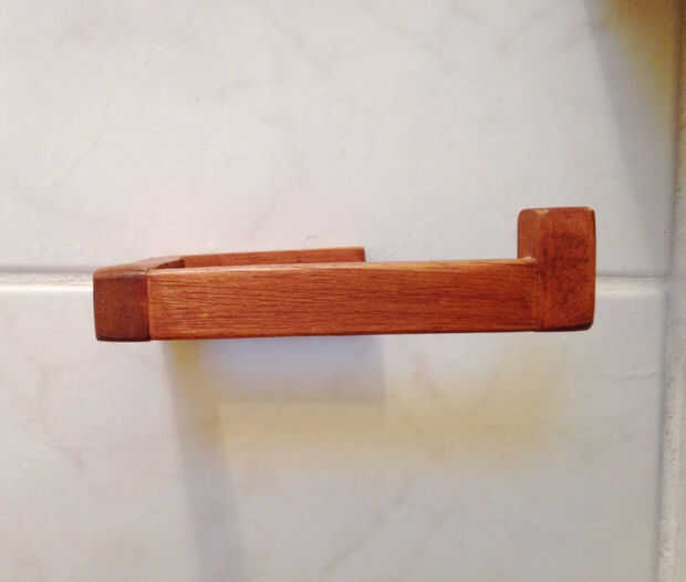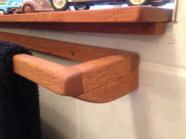 el sostenedor de la toalla es un rectángulo de madera con refuerzos de nuevo a los lados.