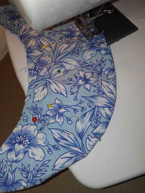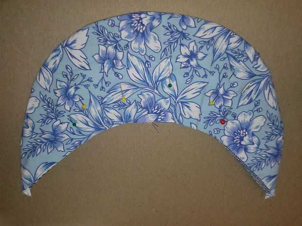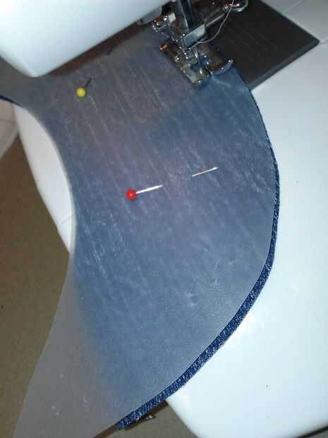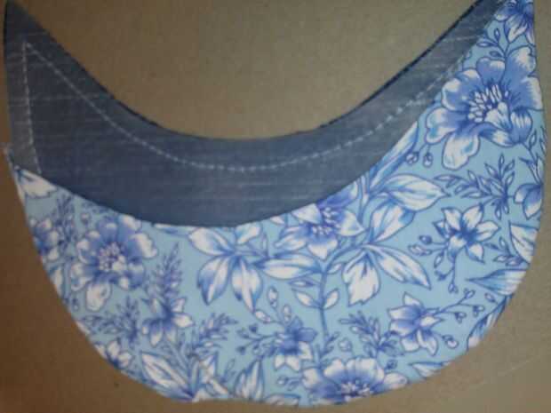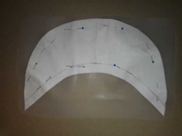 Cortar 2 piezas del borde del patrón del sombrero. Prender estos lados del derecho juntos y coser alrededor del borde con costura de 1/4". Cortar la entretela o la combinación de plástico y dril de algodón, menos el margen de costura en la parte delantera del borde. Coloque dentro del borde y pin. Puntada en todo borde 1/2" del borde. Clip de curvas hasta, pero no a través de, la costura. Doblar por la mitad y coloque un alfiler en el centro de la visera.