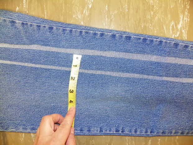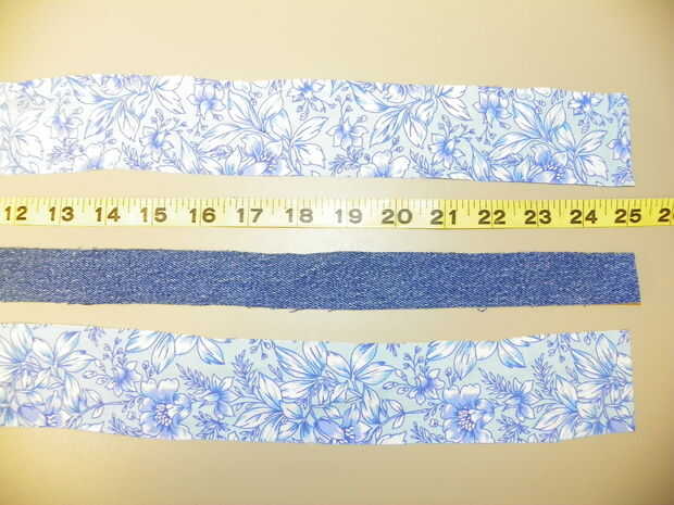 Corte un pedazo de mezclilla 1 "x 25" de la entretela de la banda de sombrero. Cortar 2 piezas de 2 "x 25" para el interior y fuera de la banda de sombrero.