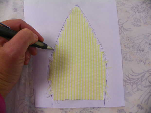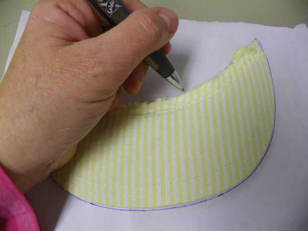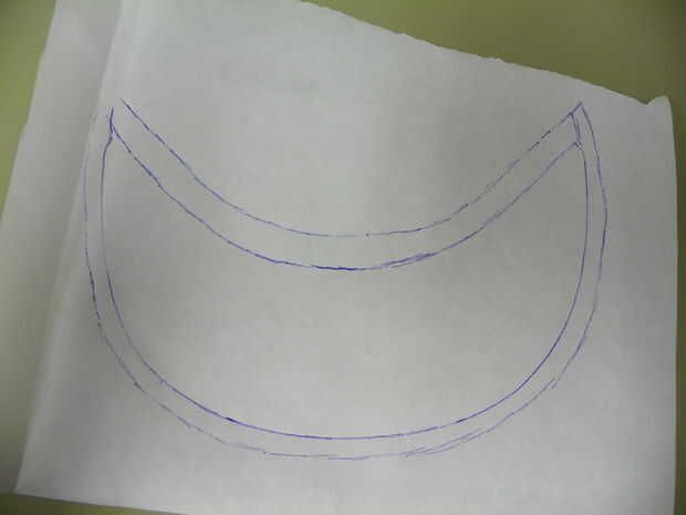 Con 1 o 2 secciones de la corona del sombrero. Desde que corte la pieza de la banda de sombrero, necesitaba añadir 1/2 margen el la parte inferior. Trace una línea alrededor de la sección. Utilicé papel de congelador pero periódico trabaja bien también. Coloque el ala del sombrero sobre el papel y trace una línea alrededor. Añadir 1/4" alrededor de borde para la costura.