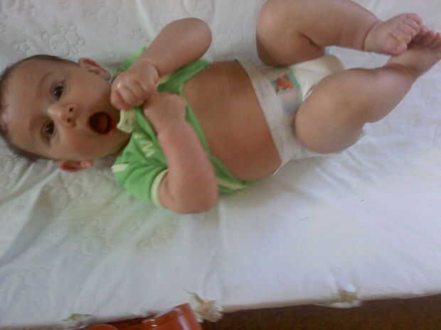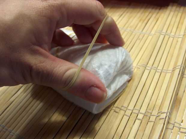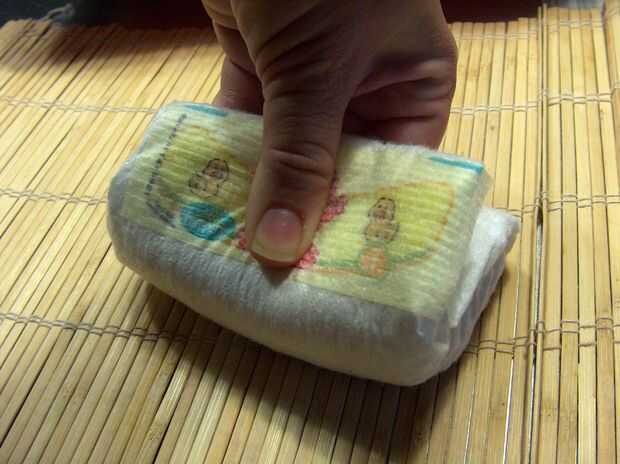 - Doblar los elásticos de la pierna alrededor de las fuentes, y el pañal a lo largo de las líneas de pliegue original. En los bordes y enrolle el pañal alrededor de las fuentes de cambio. Asegurar con goma elástica.