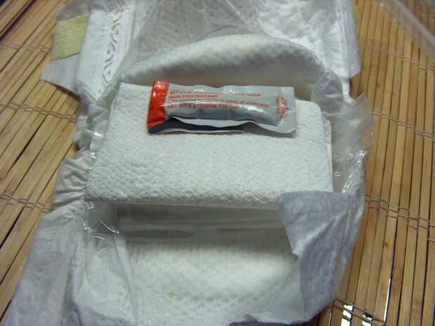 - Abra el pañal y meter los suministros (bolsa de toallitas húmedas, crema de pañal y toalla de papel) en la entrepierna del pañal.