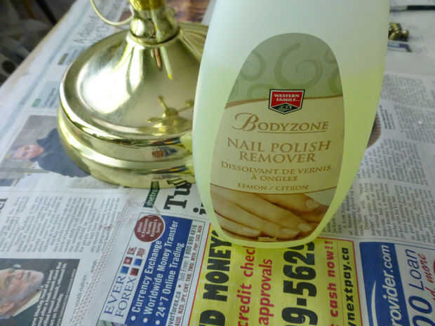 Quería minimizar el uso de productos químicos desagradables en este proceso, así que comencé por usar removedor de esmalte de uñas (con acetona). Que había aplicado a un trapo y limpiar la superficie del latón. No veo un cambio notable para el latón por lo encendió para tratar la lana de acero.