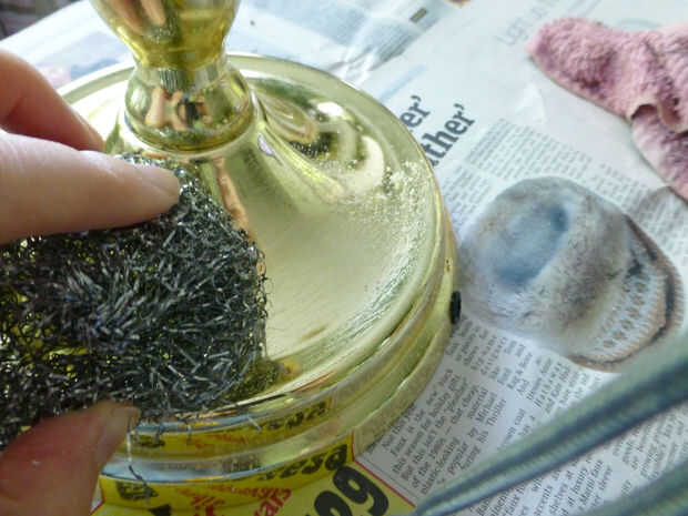 Cuando la lámpara de latón con lana de acero de limpieza pude ver escamas blanquecinas saliendo de la lámpara que llevó a ser la capa protectora. Continúa en fregar la lámpara entera para conseguir como fuera tanto como sea posible. La lámpara se veía bastante rayada hasta después de esto, tenía la esperanza de que era sólo superficial y que no dañe la superficie del metal.