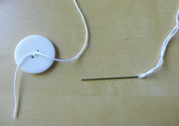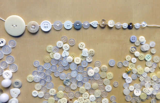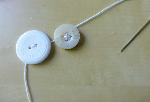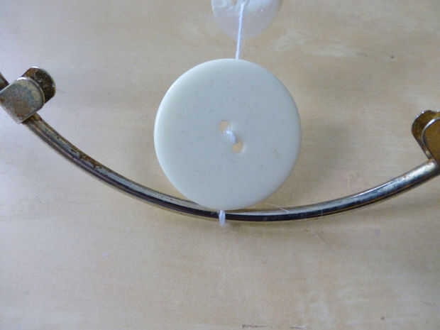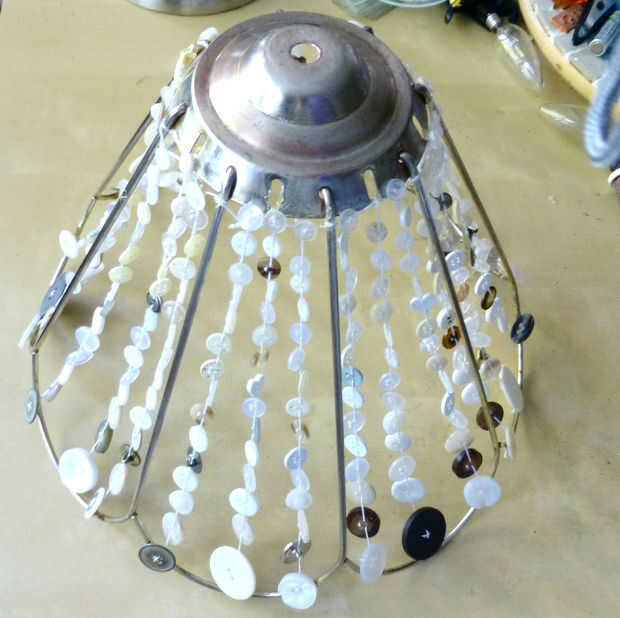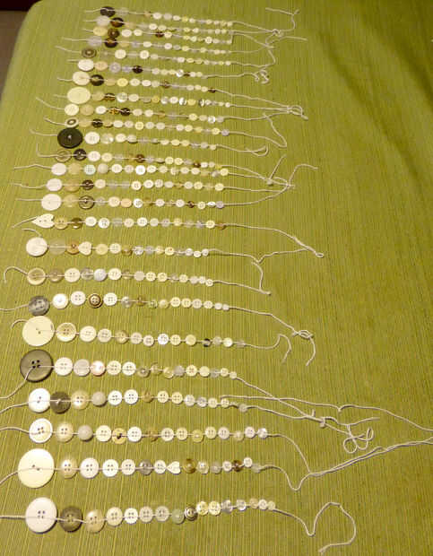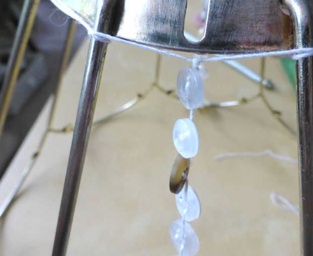 He utilizado hilo de crochet a los botones, básicamente les roscado a través de los agujeros, dejando un poco de una separación entre botones. Desde el marco de la pantalla es cónica, siendo más ancho en la parte inferior coloca botones más grandes en la parte inferior de la cadena y disminuir los tamaños de los botones hacia arriba. Una vez que se realizaron até el filamento entre la parte superior e inferior del marco (reforzado los nudos con pegamento para que sea más seguro).