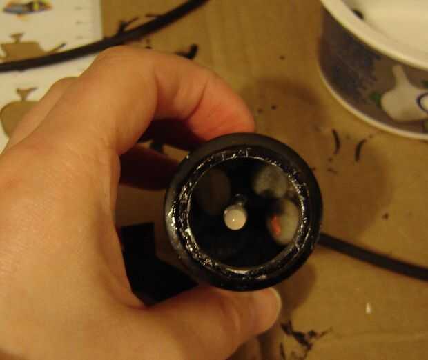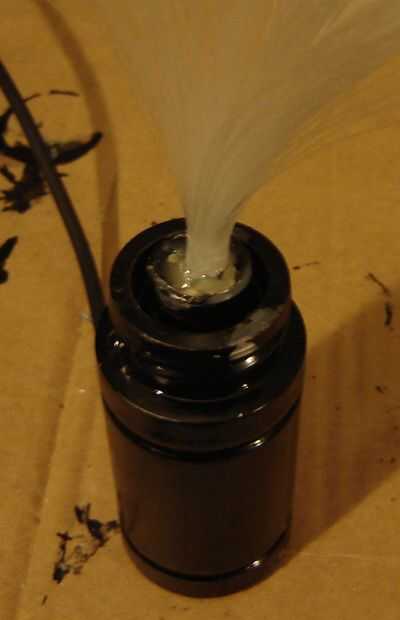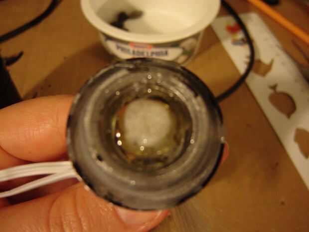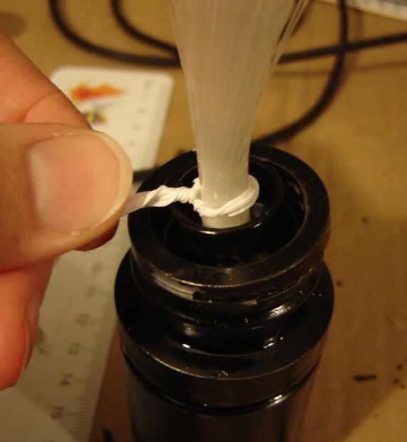 • Utilizar un sujetador de alambre para fijar el paquete de nylon del hilo de rosca con el extremo con cinta en el pico (o tapa, si eso es lo que usas), aplicar el pegamento con una pistola de pegamento alrededor del paquete, llenar los vacíos y asegúrese de que esté seguro.