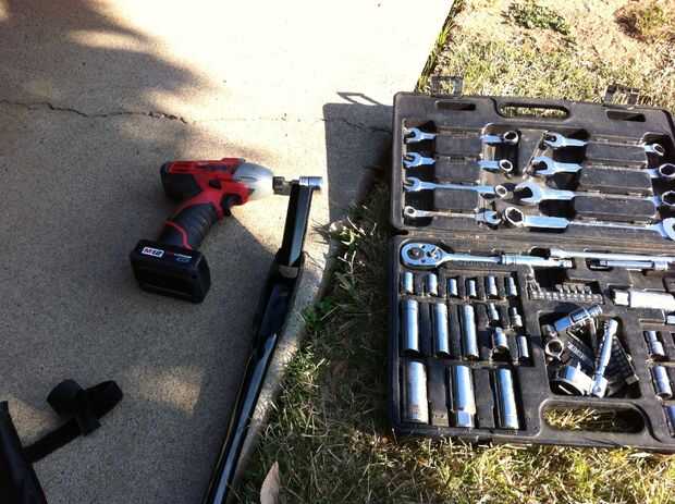 Aparte de comprar pastillas de freno nuevas (25.99 por un ajustado frente a autozone) vas a querer tener a mano lo siguiente. Enchufe y llave, llantas de hierro, cabeza plana Destornillador, 12v o conductor de impacto más fuerte y un tablero de 1 x 2 24 pulgadas de largo (nos pondremos en eso más adelante.