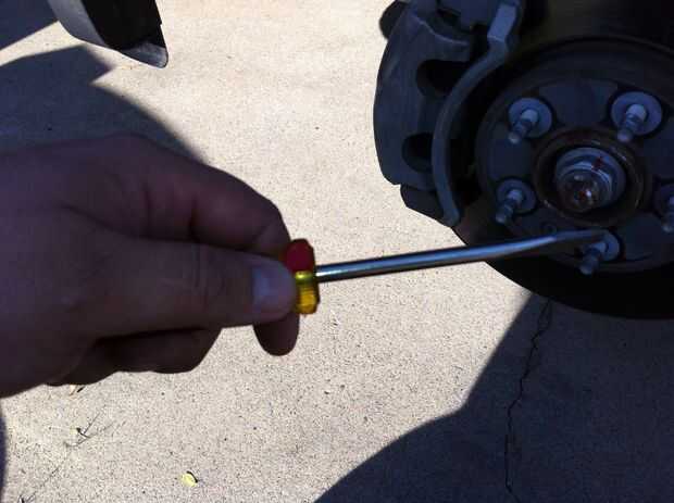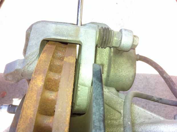 Esto es donde el sistema de expresión es importante y entra en juego. Tomando la cabeza plana Destornillador, colocarlo entre las viejas pastillas de freno y el rotor. SUAVEMENTE pero con firmeza, tire hacia atrás y levante la pinza abierta, separarse las pastillas apartes como te. Esto hace que quitar la pinza de freno fácil.