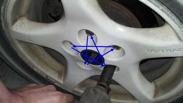 Ahora tienes tus cojines nuevo instalados y todo es bonito y apretado y seguro puede poner el neumático nuevo. Para apretar sus pernos que se sugiere dar apriete cada perno entonces para apriételos progresivamente en un patrón de estrella para dispersar la presión uniformemente en el neumático y el rotor. Al final usted debe tener todos los tornillos apretaron a un mínimo de 80 lb-pie sus dueños manual tendrá las especificaciones de su vehículo. Una vez más que necesita para asegurarse de que éstos estén apretados perno volando de su vehículo no va a arruinar tu coche pero si pierdes más uno sería malas noticias.