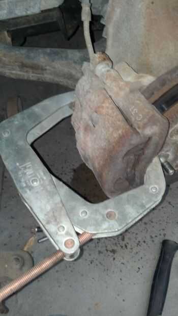 Si tu suerte te puede simplemente tirar de su pinza en la mayoría de los casos esto no funcionará. Si dosis no deslice hacia afuera el se necesita utilizar una gran c-clamp para comprimir el cilindro así que puede quitar la pinza del rotor.