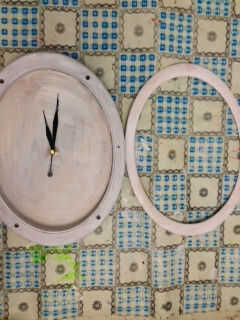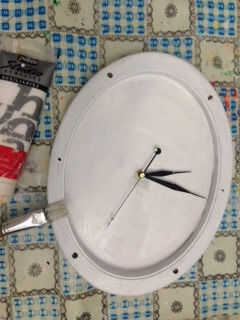 Antes de comenzar a pintar el reloj, separó el marco del reloj, el cubierta de vidrio y otras piezas que he podido. Entonces usé Gesso para que la pintura quedaría perfectamente. Aquí está el reloj después de la primera y la segunda capa de Gesso.