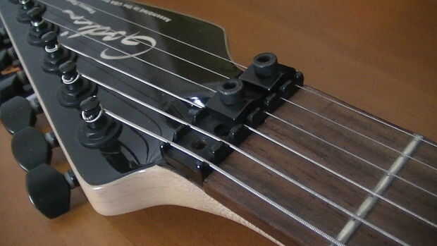 Este instructable muestra cómo afinar una guitarra con un trémolo de Floyd Rose. Estoy usando una Kramer Striker 211.Paso 1: La tuercaComo se muestra en la imagen, la tuerca es especial. En primer lugar, tenemos que desbloquear la tuerca utilizando u